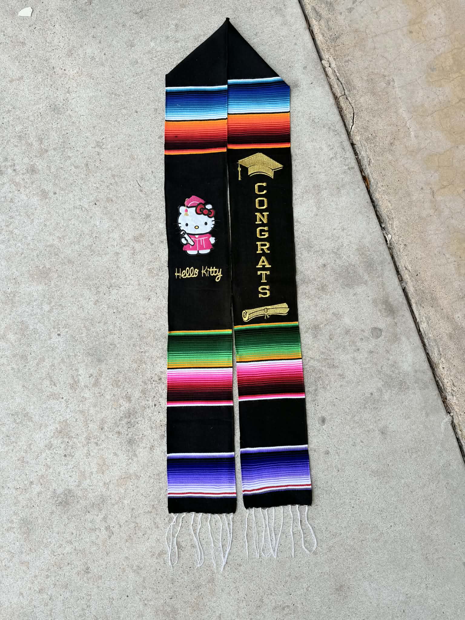 Celebrate your graduation in style with this vibrant Mexican sarape stole, featuring the beloved Hello Kitty design. Crafted with traditional artesanal techniques, this lightweight wrap drapes elegantly over your graduation gown, adding a personal touch to your special day. The colorful woven pattern honors Mexican heritage while the iconic character brings a playful spirit to your ceremony. Perfect for photos and a meaningful keepsake of your achievement.
